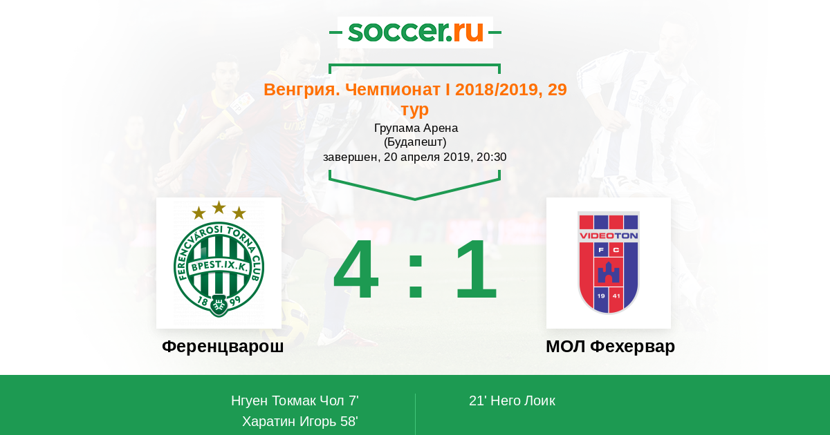 Венгрия. Кубок 13.03.2019 Ференцварош Логотип футбольный клуб Ференцварош (Будапешт) 1:2 Логотип футбольный клуб МОЛ Види (Секешфехервар) МОЛ Види