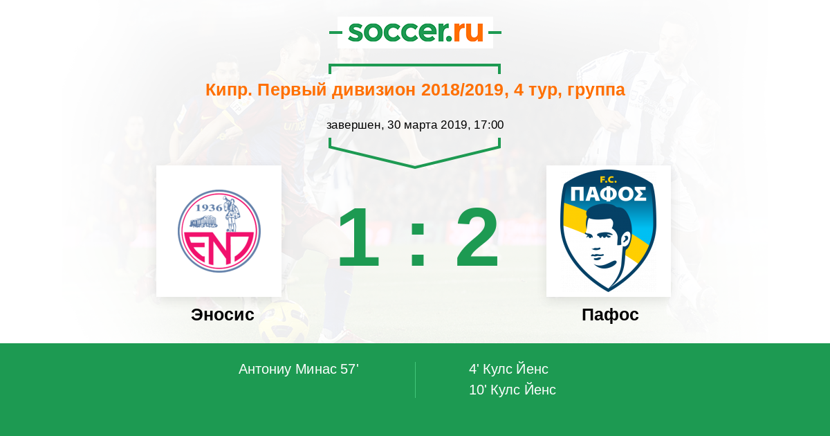 Кипр. Первый Дивизион 12.02.2011 Эносис Логотип футбольный клуб Эносис (Паралимни) 2:1 Логотип футбольный клуб Пафос Пафос
