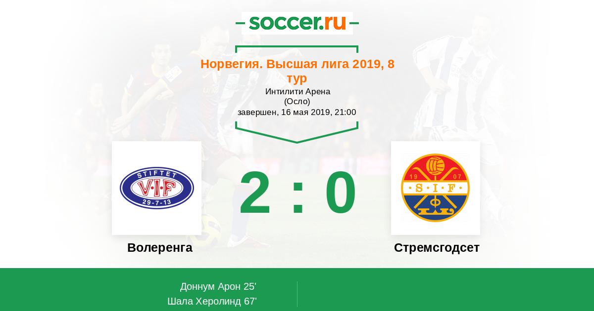 Норвегия. Высшая лига 22.05.2016 Стремсгодсет Логотип футбольный клуб Стремсгодсет (Драммен) 3:2 Логотип футбольный клуб Волеренга (Осло) Волеренга