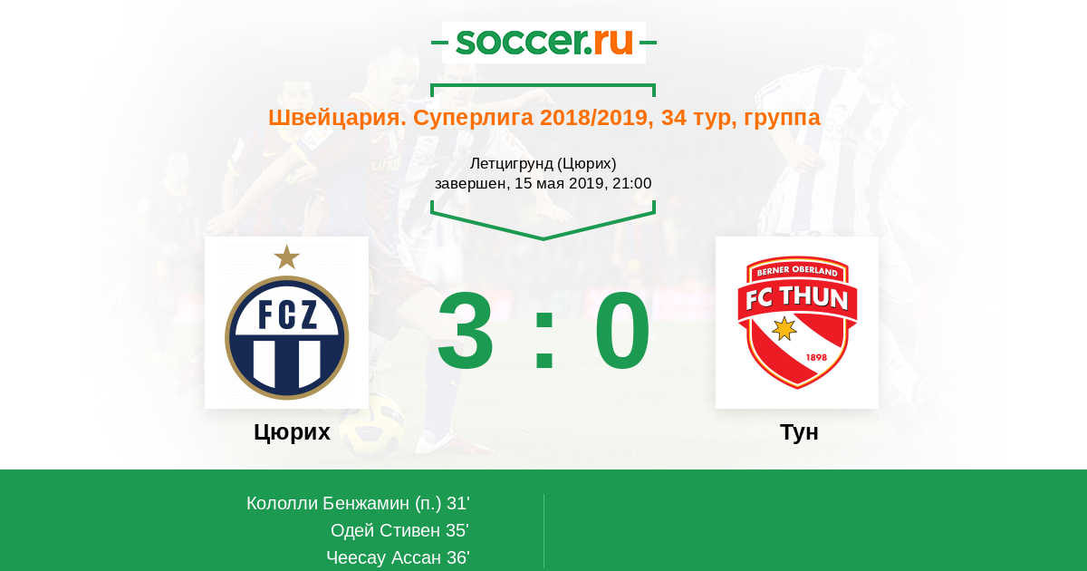 Швейцария. Суперлига 09.05.2018 Тун Логотип футбольный клуб Тун 0:1 Логотип футбольный клуб Цюрих Цюрих