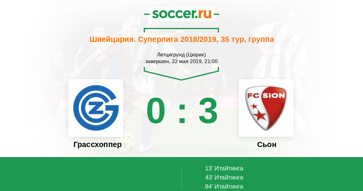 Швейцария. Суперлига 16.05.2013 Сьон Логотип футбольный клуб Сьон 0:4 Логотип футбольный клуб Грассхоппер (Цюрих) Грассхоппер