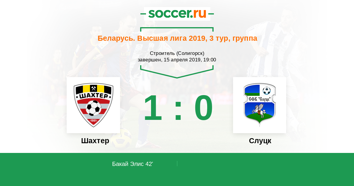 Беларусь. Высшая лига 11.04.2015 Шахтер Логотип футбольный клуб Шахтер (Солигорск) 2:0 Логотип футбольный клуб Слуцк Слуцк