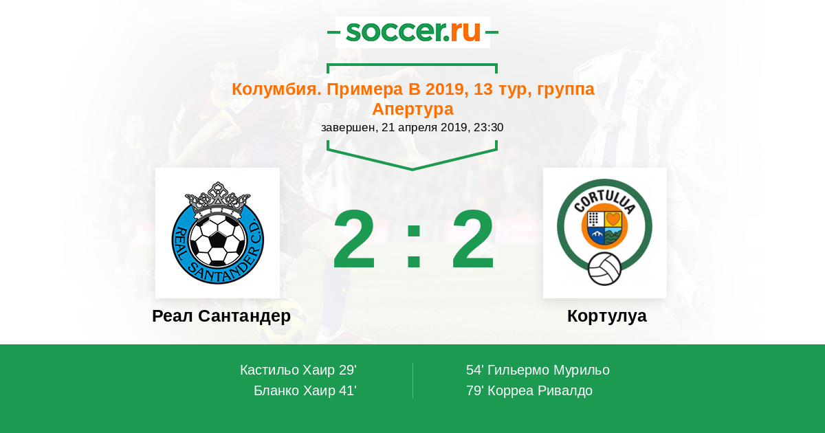 Колумбия. Примера B 30.09.2018 Кортулуа Логотип футбольный клуб Кортулуа 2:0 Логотип футбольный клуб Реал Сантандер (Букараманга) Реал Сантандер