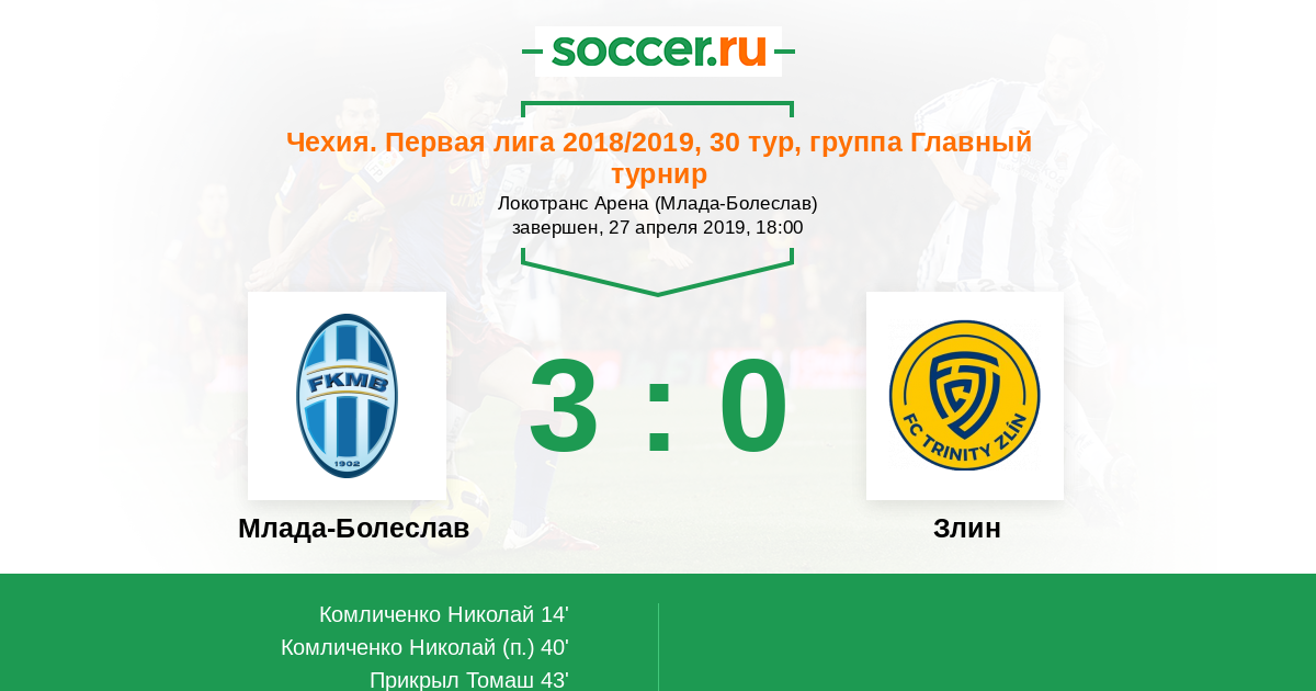 Чехия. Первая Лига 29.04.2017 Злин Логотип футбольный клуб Злин 1:2 Логотип футбольный клуб Млада-Болеслав Млада-Болеслав