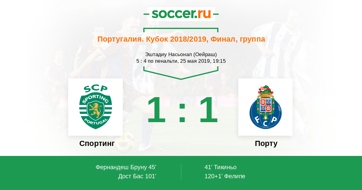 Португалия. Кубок 18.04.2018 Спортинг Логотип футбольный клуб Спортинг (Лиссабон) 1:0 (5:4) Логотип футбольный клуб Порту Порту