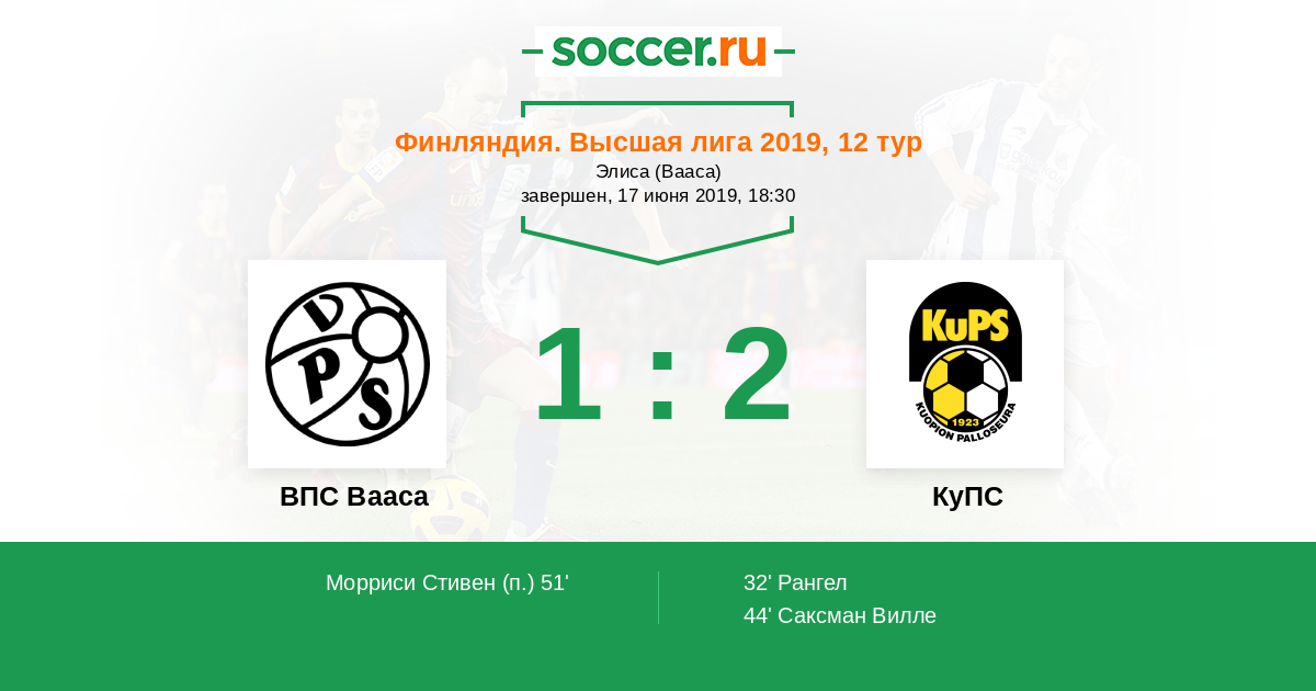 Финляндия. Высшая лига 11.06.2014 ВПС Вааса Логотип футбольный клуб ВПС Вааса 0:3 Логотип футбольный клуб КуПС (Купио) КуПС