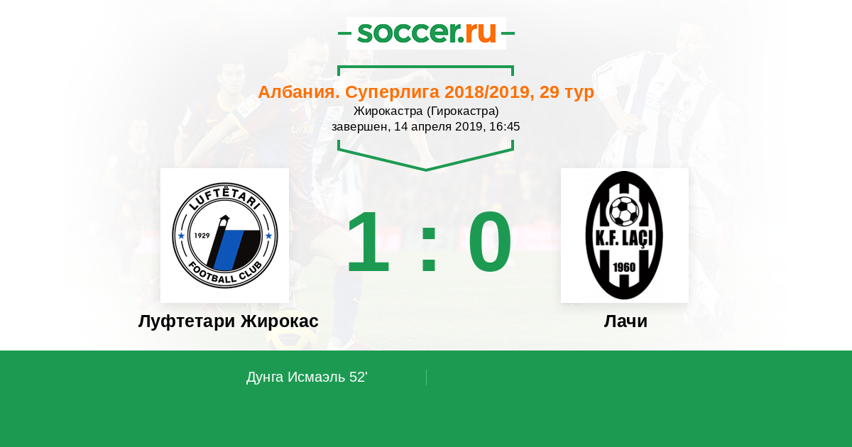 Албания. Суперлига 03.02.2019 Лачи Логотип футбольный клуб Лачи 0:2 Логотип футбольный клуб Луфтетари Жирокас (Жирокастер) Луфтетари Жирокас
