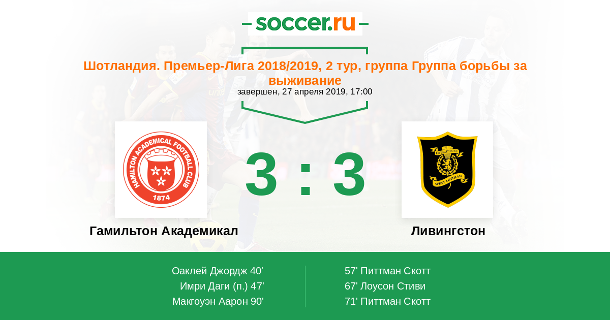 Шотландия. Премьер-Лига 03.04.2019 Ливингстон Логотип футбольный клуб Ливингстон 2:0 Логотип футбольный клуб Гамильтон Академикал Гамильтон Академикал