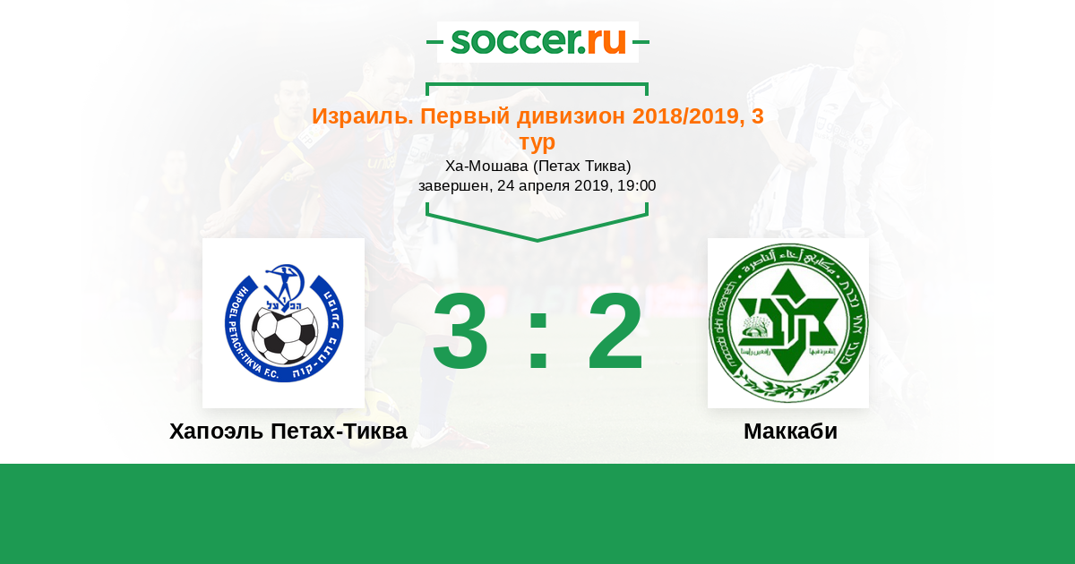 Израиль. Первый дивизион 25.02.2019 Хапоэль Петах-Тиква Логотип футбольный клуб Хапоэль Петах-Тиква 1:2 Логотип футбольный клуб Маккаби (Ахи Назарет) Маккаби