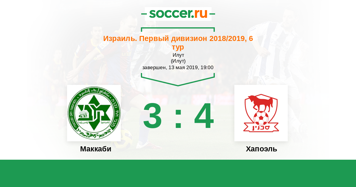 Израиль. Первый дивизион 29.03.2013 Маккаби Логотип футбольный клуб Маккаби (Ахи Назарет) 2:3 Логотип Хапоэль (Бней Лод) Хапоэль