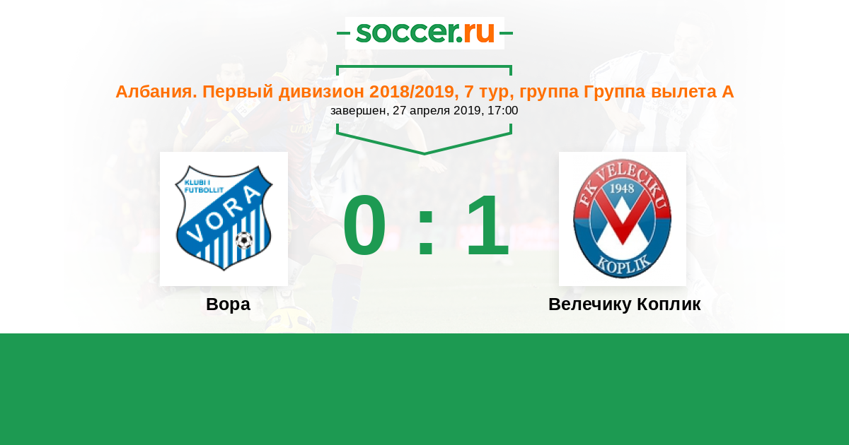 Албания. Первый дивизион 27.04.2019 Вора Логотип футбольный клуб Вора 0:1 Логотип футбольный клуб Велечику Коплик Велечику Коплик