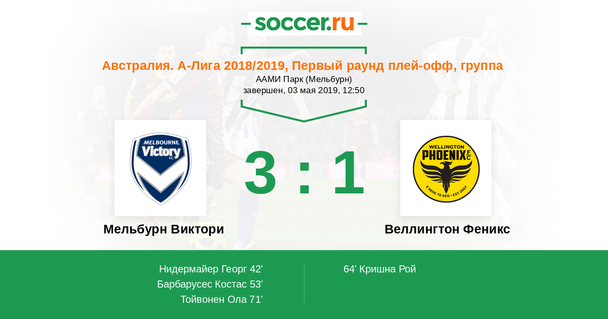 Австралия. А-Лига 02.04.2017 Мельбурн Виктори Логотип футбольный клуб Мельбурн Виктори 0:3 Логотип футбольный клуб Веллингтон Феникс Веллингтон Феникс