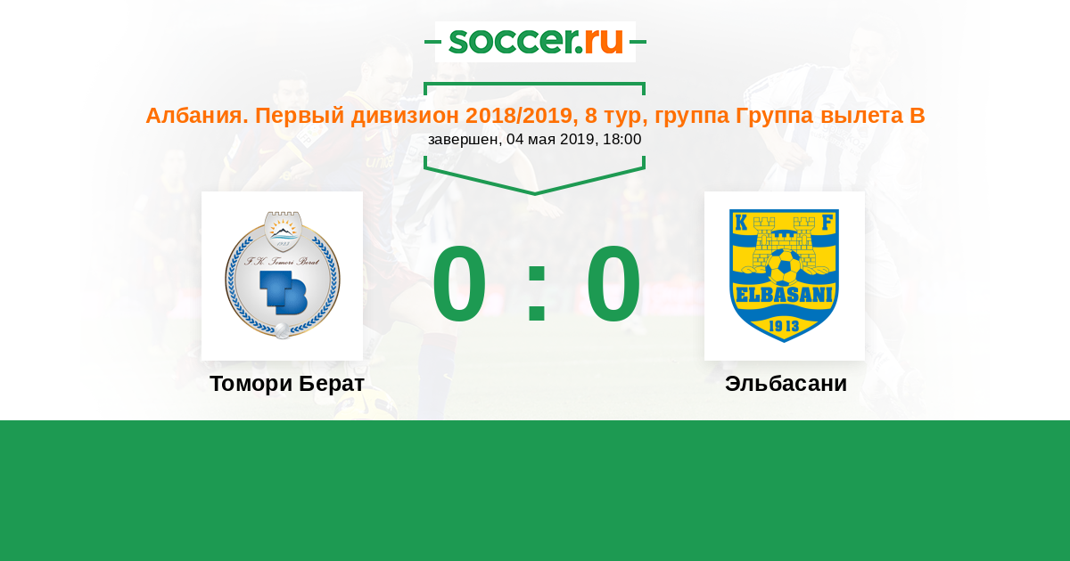 Албания. Первый дивизион 04.05.2019 Томори Берат Логотип футбольный клуб Томори Берат 0:0 Логотип футбольный клуб Эльбасани Эльбасани