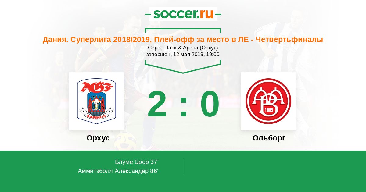 Дания. Суперлига 05.05.2019 Ольборг Логотип футбольный клуб Ольборг 0:1 Логотип футбольный клуб Орхус Орхус