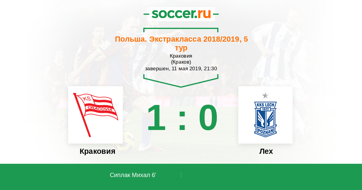 Польша. Экстракласса 29.07.2018 Лех Логотип футбольный клуб Лех (Познань) 2:0 Логотип футбольный клуб Краковия Краковия