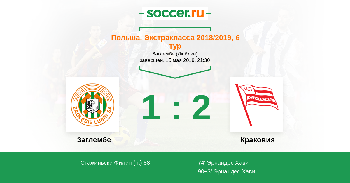 Польша. Экстракласса 17.08.2018 Краковия Логотип футбольный клуб Краковия 0:1 Логотип футбольный клуб Заглембе (Любина) Заглембе