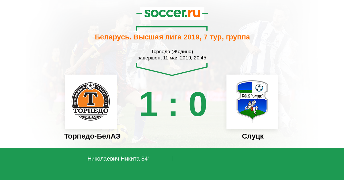 Беларусь. Высшая лига 06.06.2020 Слуцк Логотип футбольный клуб Слуцк 1:1 Логотип футбольный клуб Торпедо-БелАЗ (Жодино) Торпедо-БелАЗ