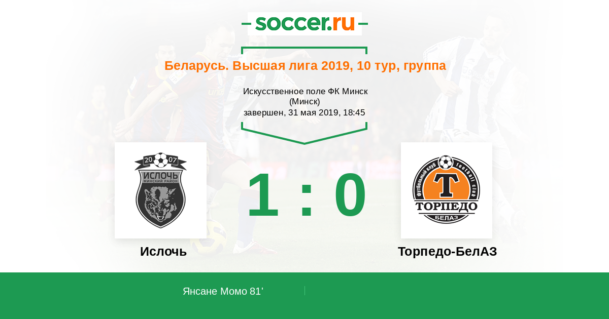Беларусь. Высшая лига 20.06.2020 Ислочь Логотип футбольный клуб Ислочь (Минск) 2:2 Логотип футбольный клуб Торпедо-БелАЗ (Жодино) Торпедо-БелАЗ
