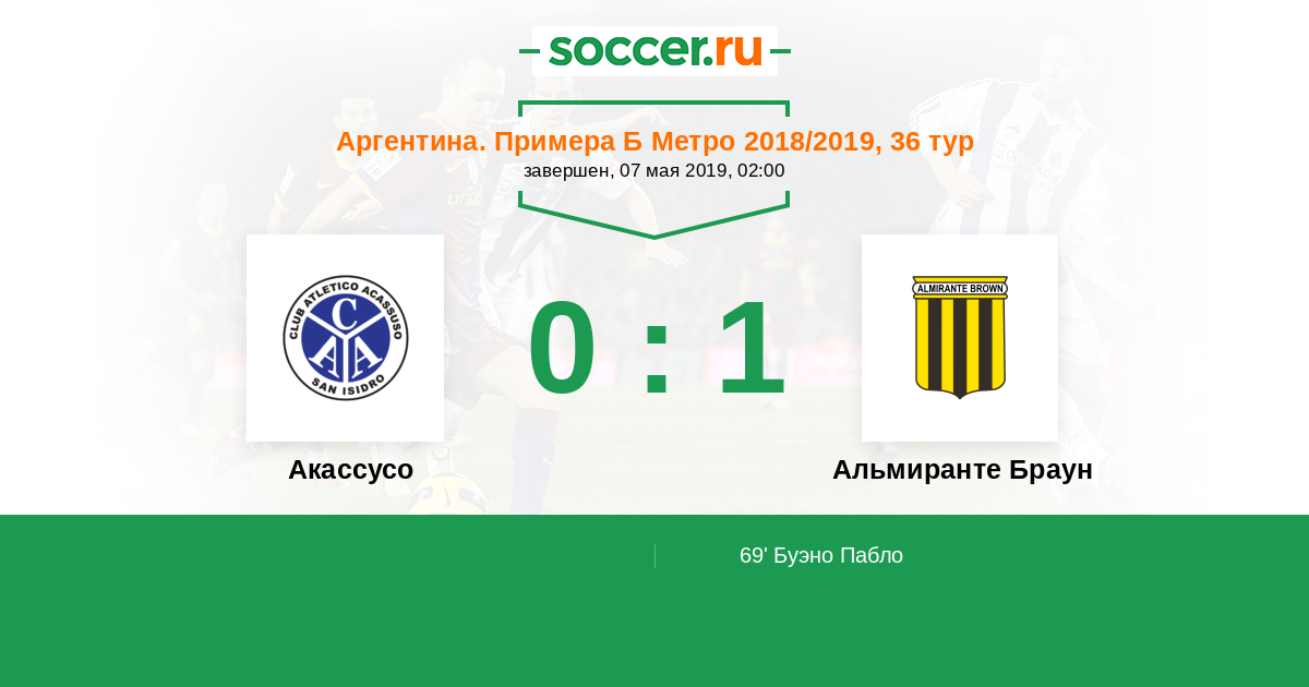 Аргентина. Примера Б Метро 13.04.2018 Акассусо Логотип футбольный клуб Акассусо (Сан-Исидро) 1:0 Логотип футбольный клуб Альмиранте Браун (Буэнос-Айрес) Альмиранте Браун