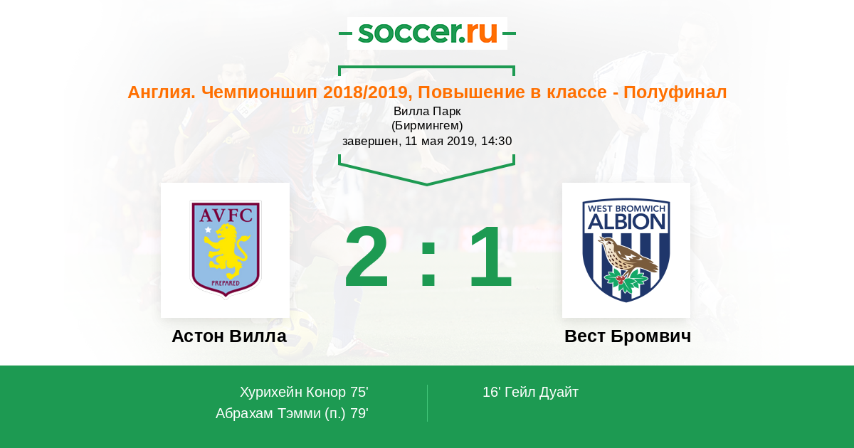 Англия. Чемпионшип 14.05.2019 Вест Бромвич Логотип футбольный клуб Вест Бромвич 1:0 (3:4) Логотип футбольный клуб Астон Вилла (Бирмингем) Астон Вилла
