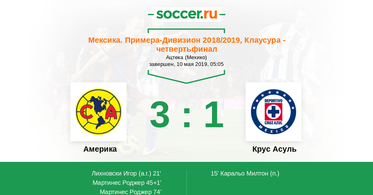 Мексика. Примера-Дивизион 13.05.2019 Крус Асуль Логотип футбольный клуб Крус Асуль (Мехико) 1:0 Логотип футбольный клуб Америка (Мехико) Америка