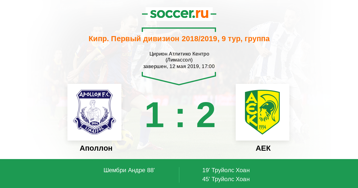 Кипр. Первый Дивизион 22.12.2012 Аполлон Логотип футбольный клуб Аполлон (Лимассол) 1:2 Логотип футбольный клуб АЕК (Ларнака) АЕК