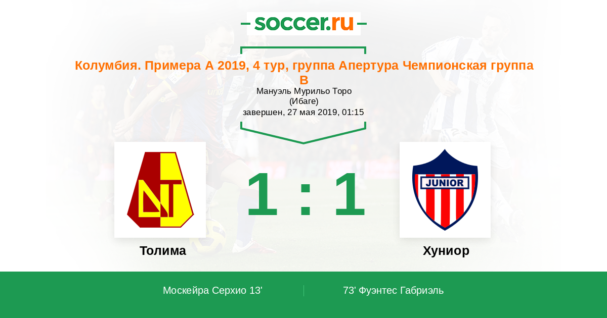 Колумбия. Примера А 14.07.2019 Хуниор Логотип футбольный клуб Хуниор (Барранкилья) 1:0 Логотип футбольный клуб Толима (Ибаге) Толима