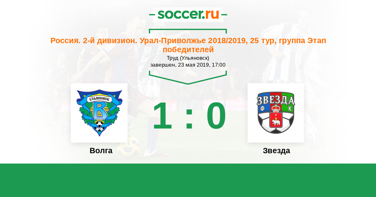 Россия. Вторая лига. Группа 4 02.08.2018 Волга Логотип футбольный клуб Волга (Ульяновск) 2:0 Логотип футбольный клуб Звезда (Пермь) Звезда