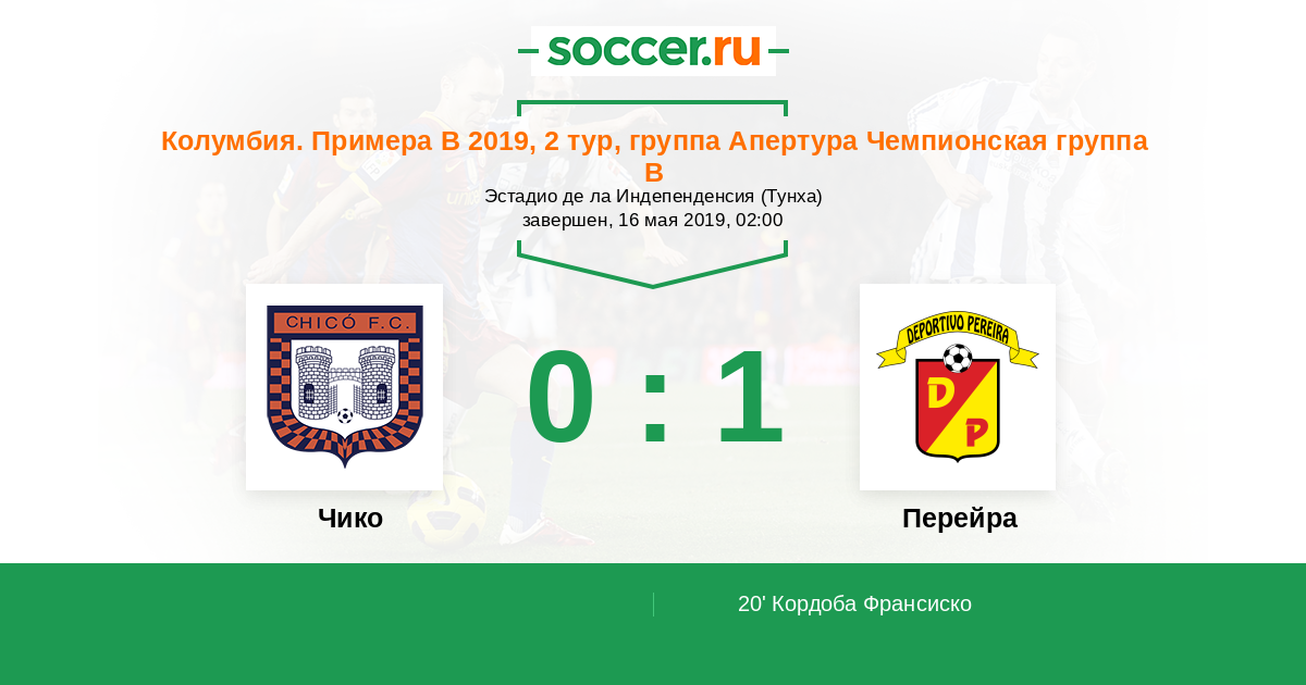 Колумбия. Примера B 20.08.2019 Перейра Логотип футбольный клуб Перейра 1:0 Логотип футбольный клуб Чико (Тунха) Чико