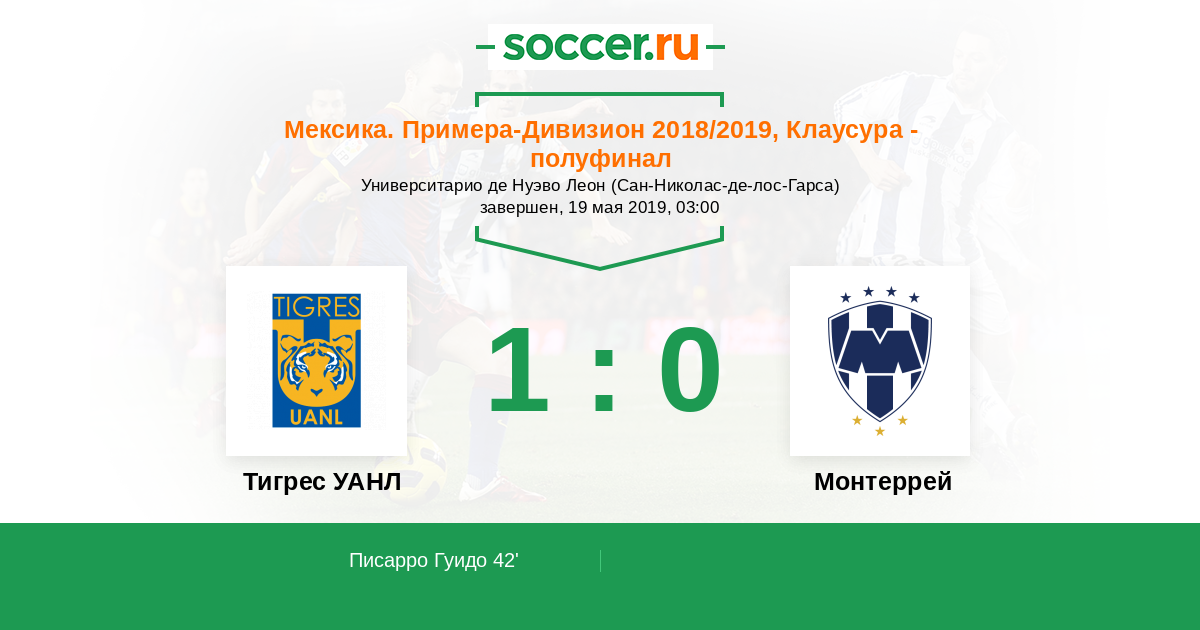 Мексика. Примера-Дивизион 16.05.2019 Монтеррей Логотип футбольный клуб Монтеррей 1:0 Логотип футбольный клуб Тигрес УАНЛ (Монтеррей) Тигрес УАНЛ