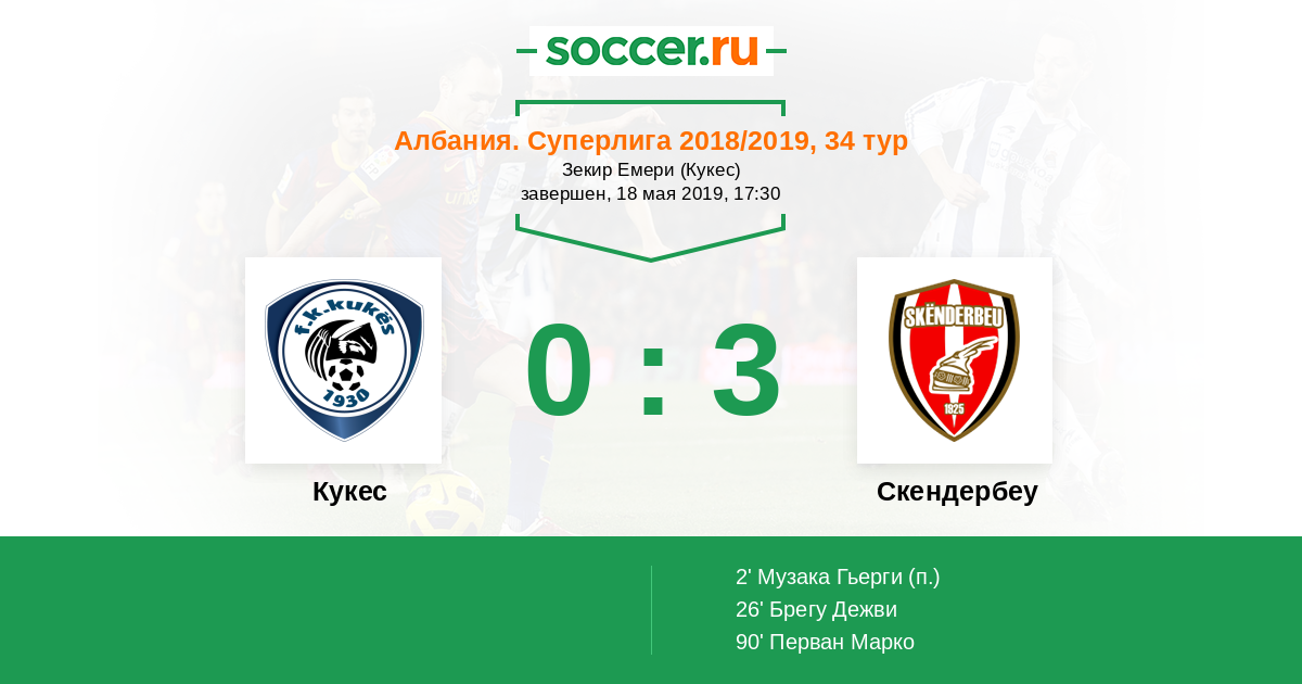 Албания. Суперлига 07.12.2018 Кукес Логотип футбольный клуб Кукес 1:0 Логотип футбольный клуб Скендербеу (Корча) Скендербеу