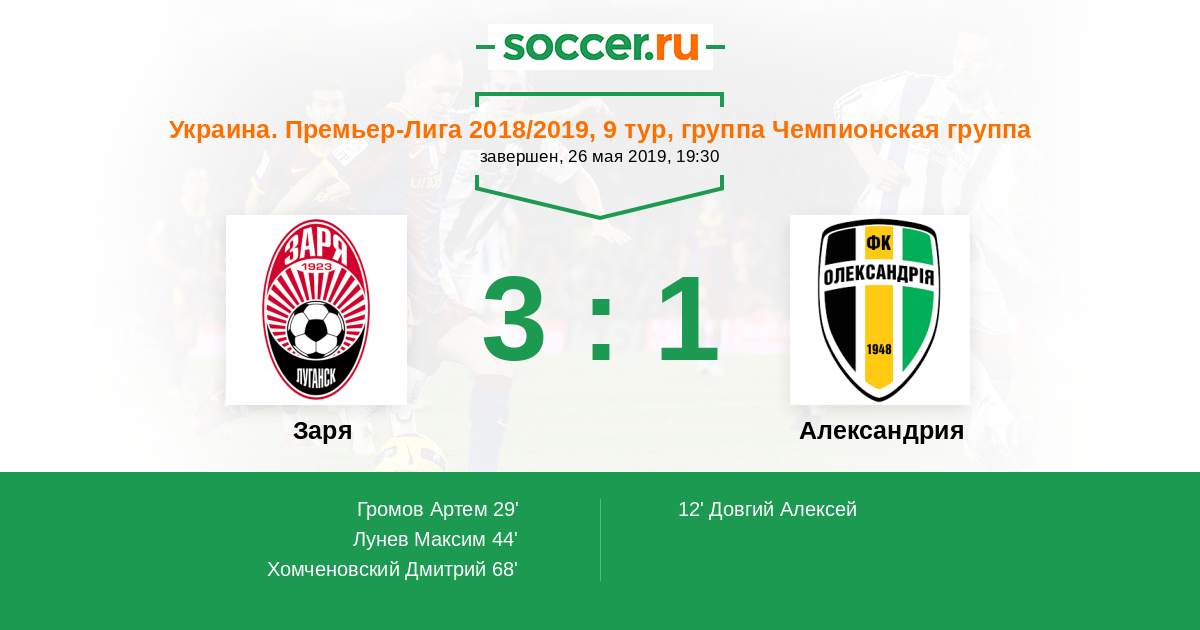 Украина. Премьер-Лига 18.08.2019 Заря Логотип футбольный клуб Заря (Луганск) 1:2 Логотип футбольный клуб Александрия Александрия