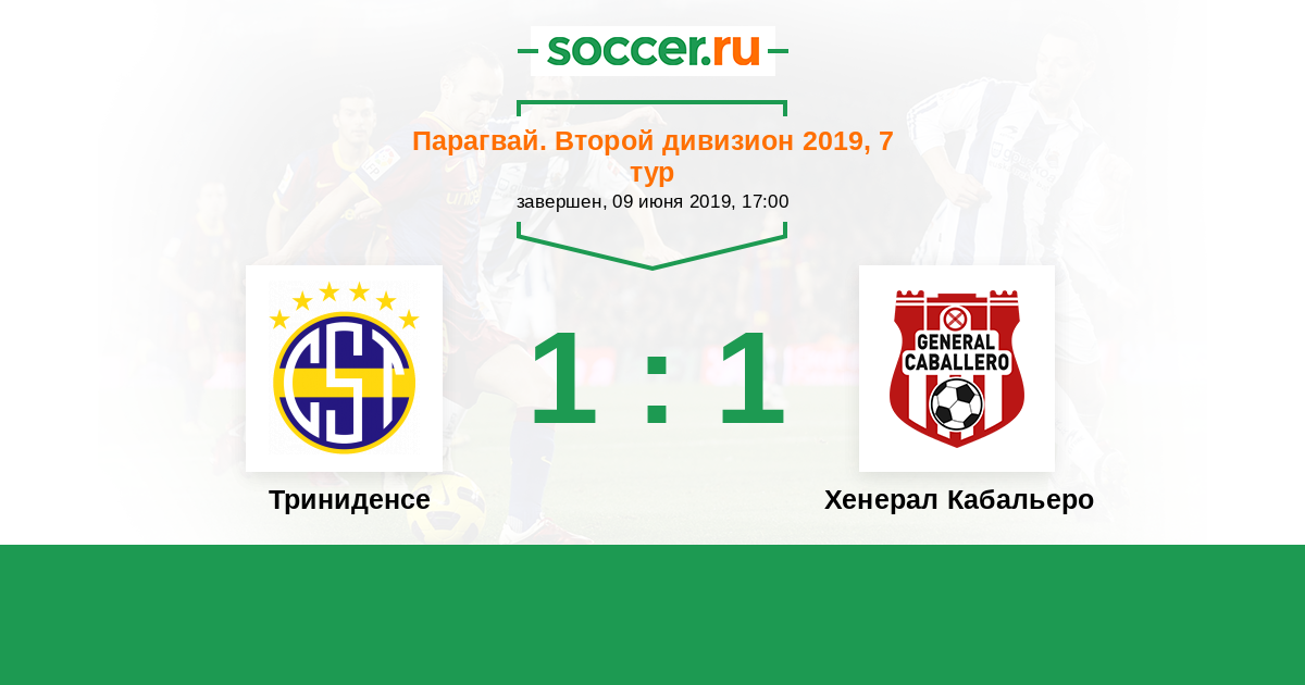 Парагвай. Второй дивизион 01.07.2018 Триниденсе Логотип футбольный клуб Триниденсе (Асунсьон) 2:0 Логотип футбольный клуб Хенерал Кабальеро (Доктор-Хуан-Леон-Майоркин) Хенерал Кабальеро