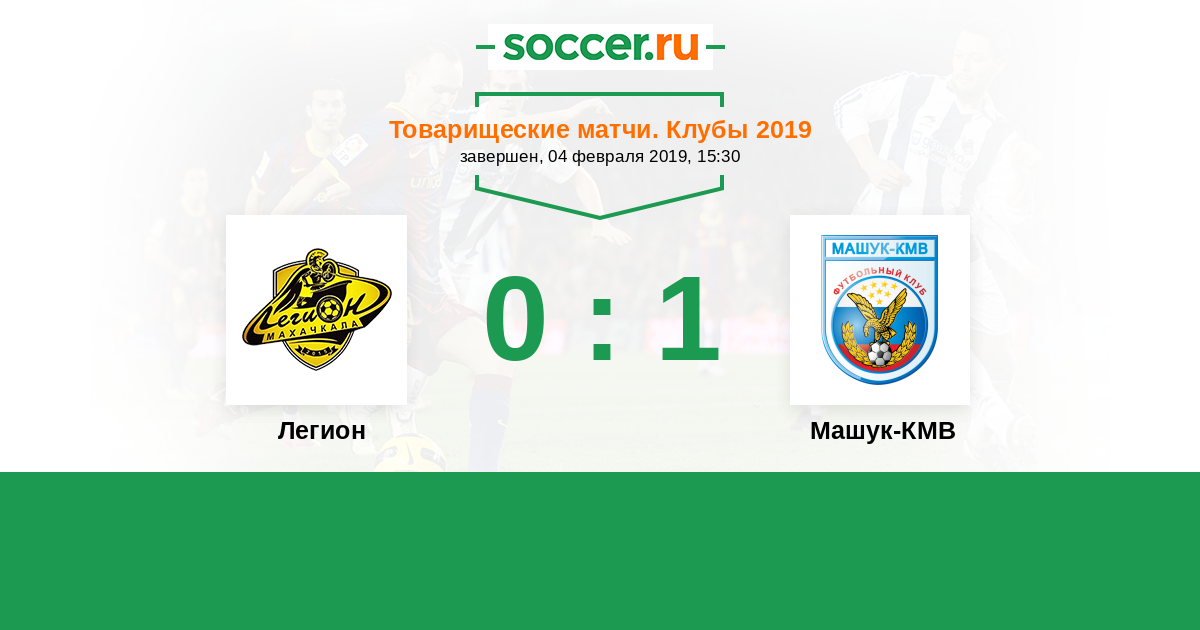 Товарищеские матчи. Клубы 07.07.2019 Машук-КМВ Логотип футбольный клуб Машук-КМВ (Пятигорск) 2:1 Логотип футбольный клуб Легион (Махачкала) Легион