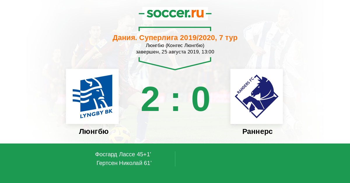 Дания. Суперлига 20.08.2023 Люнгбю Логотип футбольный клуб Люнгбю (Конгес Люнгбю) 1:0 Логотип футбольный клуб Раннерс Раннерс
