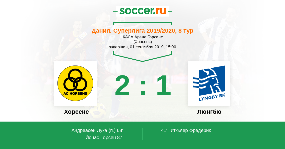 Дания. Суперлига 20.11.2020 Люнгбю Логотип футбольный клуб Люнгбю (Конгес Люнгбю) 1:1 Логотип футбольный клуб Хорсенс Хорсенс