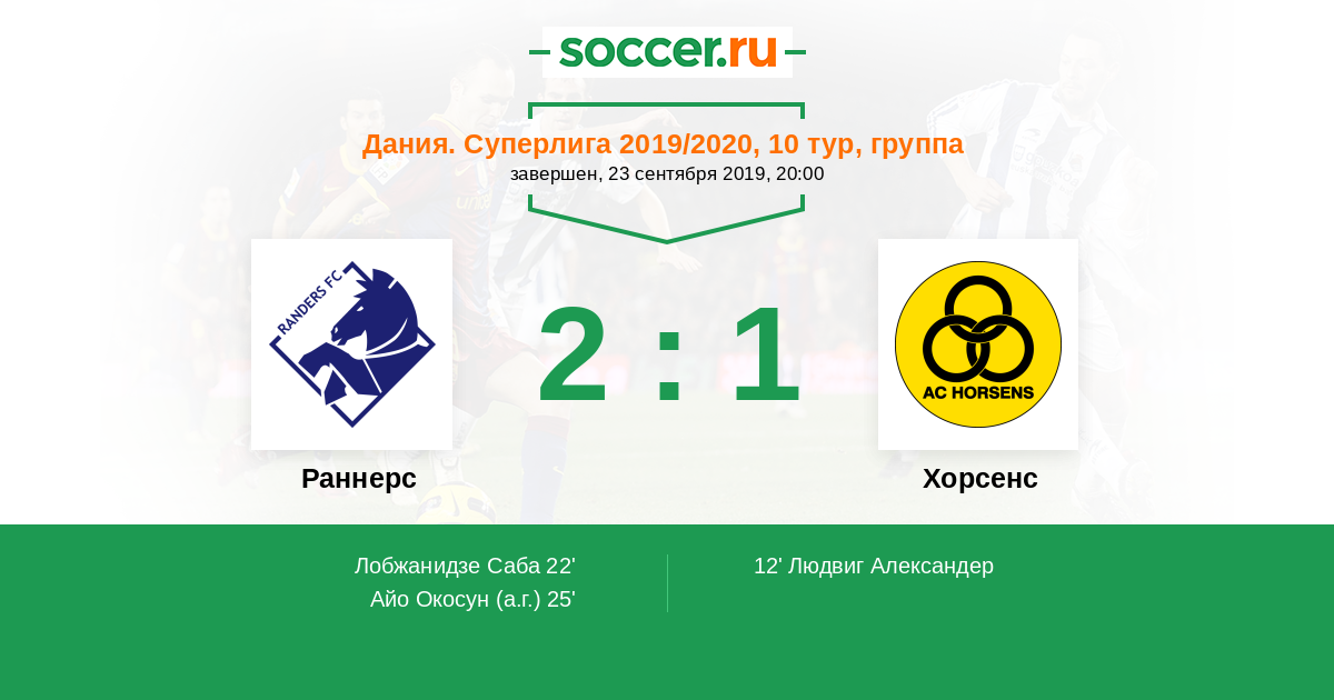 Дания. Суперлига 13.09.2020 Хорсенс Логотип футбольный клуб Хорсенс 0:3 Логотип футбольный клуб Раннерс Раннерс