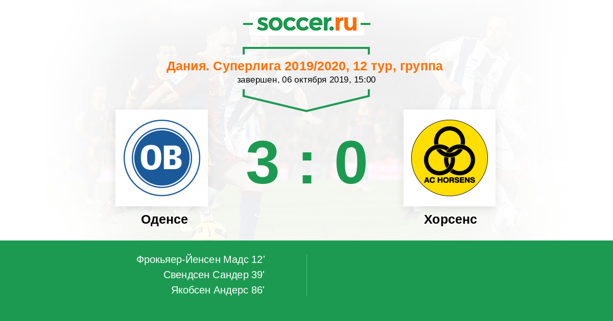 Дания. Суперлига 01.12.2019 Хорсенс Логотип футбольный клуб Хорсенс 2:1 Логотип футбольный клуб Оденсе Оденсе