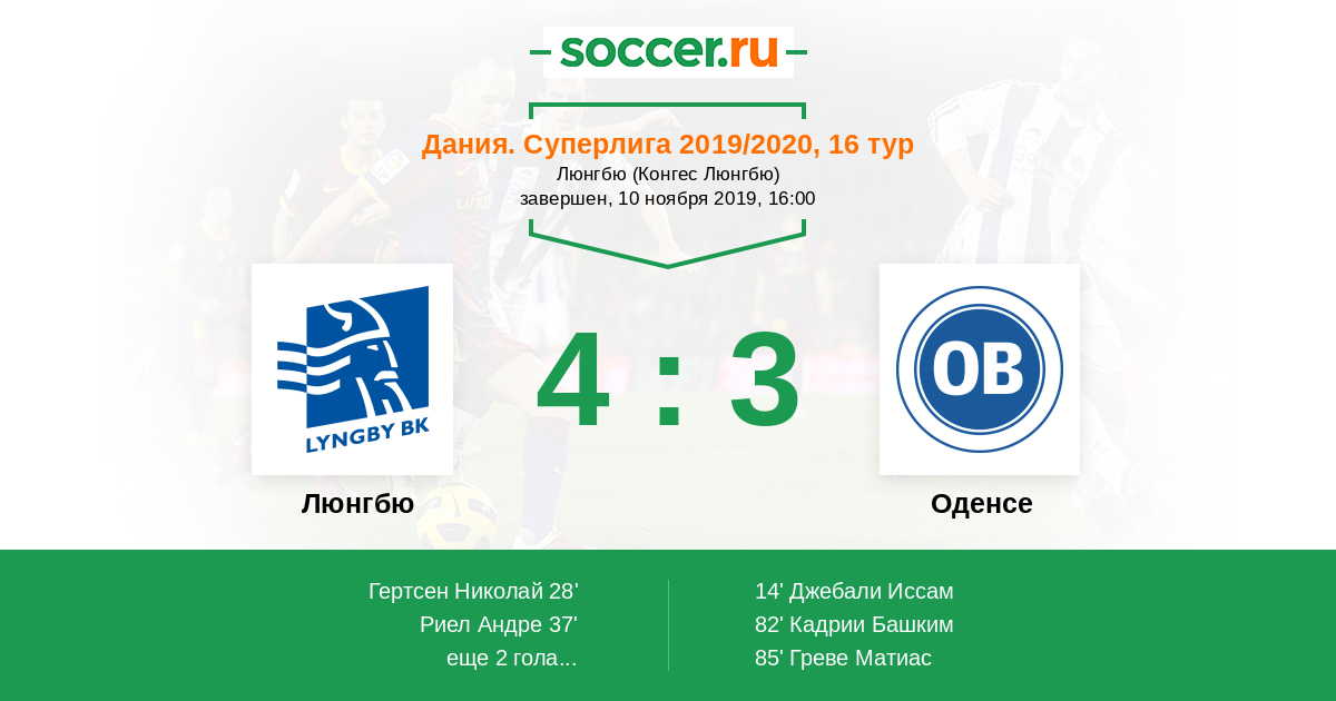 Дания. Суперлига 22.06.2020 Люнгбю Логотип футбольный клуб Люнгбю (Конгес Люнгбю) 1:2 Логотип футбольный клуб Оденсе Оденсе
