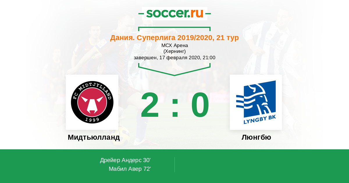 Дания. Суперлига 19.09.2020 Мидтьюлланд Логотип футбольный клуб Мидтьюлланд (Хернинг) 1:0 Логотип футбольный клуб Люнгбю (Конгес Люнгбю) Люнгбю