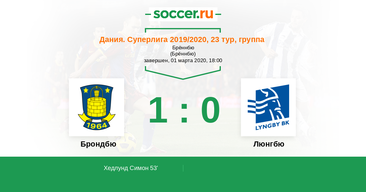 Дания. Суперлига 20.10.2019 Люнгбю Логотип футбольный клуб Люнгбю (Конгес Люнгбю) 0:3 Логотип футбольный клуб Брондбю (Брённбю) Брондбю