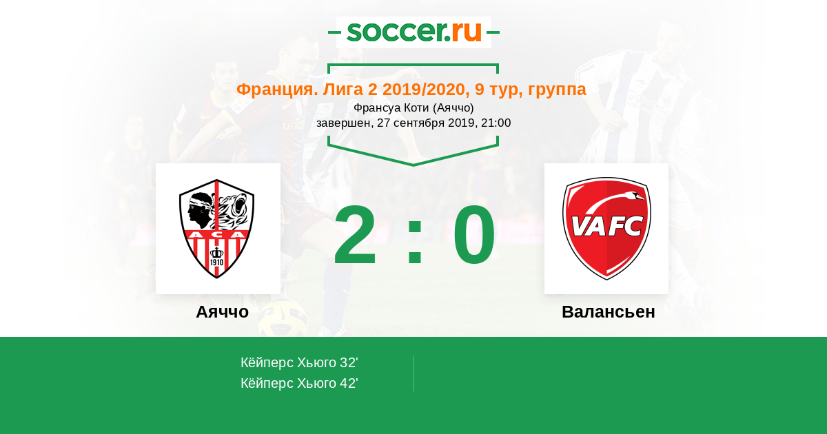 Франция. Лига 2 19.09.2017 Аяччо Логотип футбольный клуб Аяччо 3:0 Логотип футбольный клуб Валансьен Валансьен
