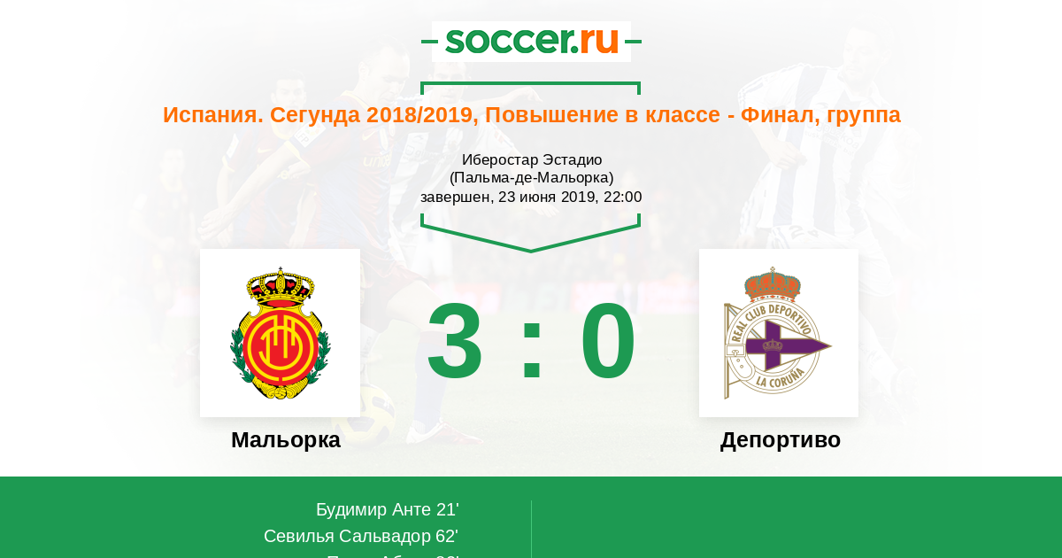 Испания. Сегунда 20.06.2019 Депортиво Логотип футбольный клуб Депортиво (Ла-Корунья) 2:0 Логотип футбольный клуб Мальорка (Пальма-де-Мальорка) Мальорка