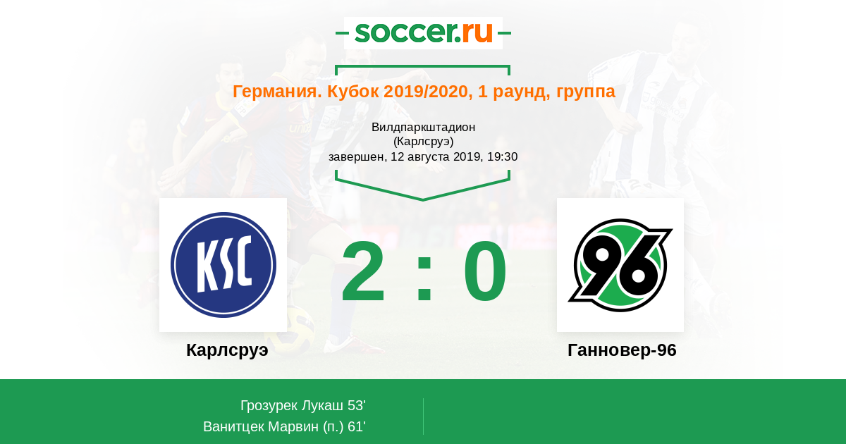 Германия. Кубок 19.08.2018 Карлсруэ Логотип футбольный клуб Карлсруэ 0:6 Логотип футбольный клуб Ганновер-96 Ганновер-96