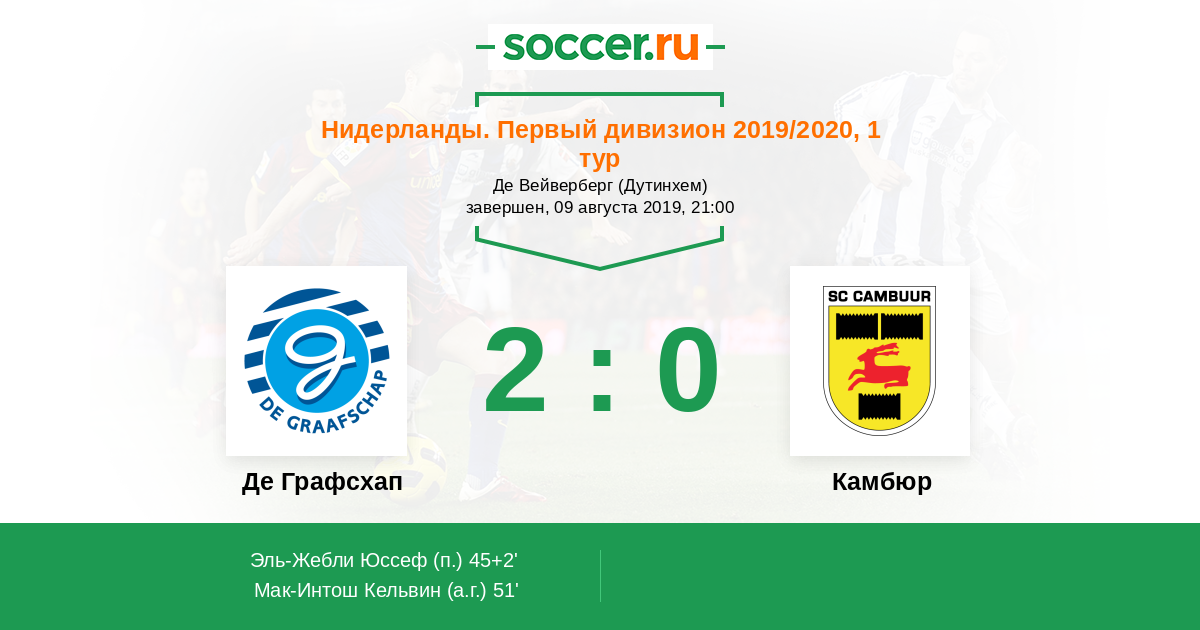 Нидерланды. Первый дивизион 25.08.2017 Де Графсхап Логотип футбольный клуб Де Графсхап (Дутинхем) 2:0 Логотип футбольный клуб Камбюр (Лиуварден) Камбюр