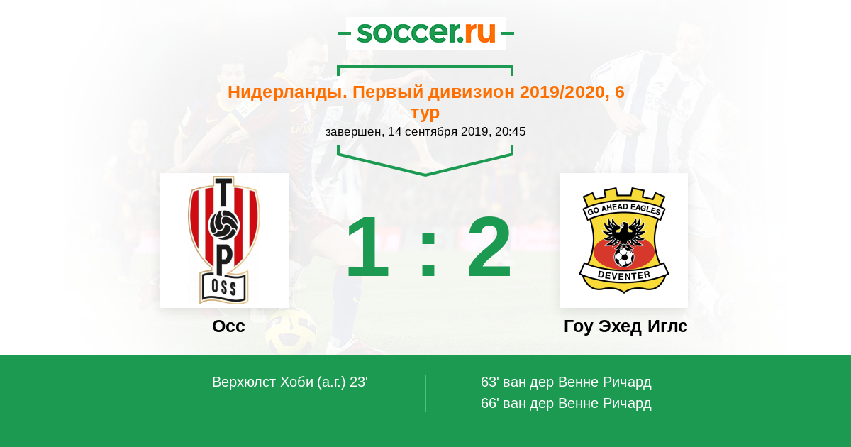 Нидерланды. Первый дивизион 06.10.2017 Осс Логотип футбольный клуб Осс 1:6 Логотип футбольный клуб Гоу Эхед Иглс (Девентер) Гоу Эхед Иглс