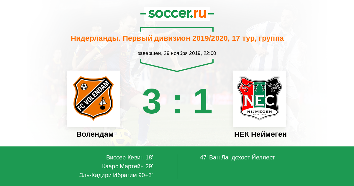 Нидерланды. Первый дивизион 20.10.2017 Волендам Логотип футбольный клуб Волендам 0:2 Логотип футбольный клуб НЕК Неймеген НЕК Неймеген