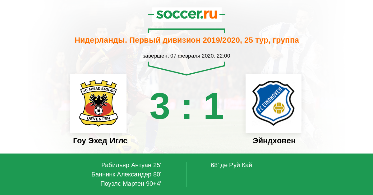Нидерланды. Первый дивизион 05.02.2021 Эйндховен Логотип футбольный клуб Эйндховен 0:2 Логотип футбольный клуб Гоу Эхед Иглс (Девентер) Гоу Эхед Иглс