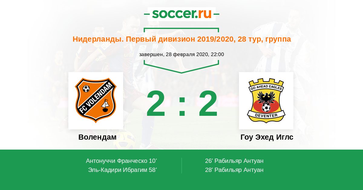 Нидерланды. Первый дивизион 27.09.2020 Волендам Логотип футбольный клуб Волендам 0:0 Логотип футбольный клуб Гоу Эхед Иглс (Девентер) Гоу Эхед Иглс