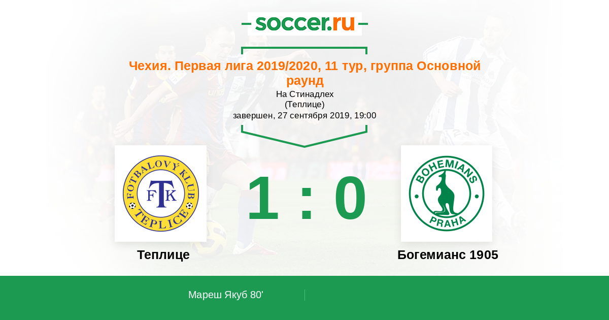Чехия. Первая Лига 12.04.2019 Теплице Логотип футбольный клуб Теплице 1:2 Логотип футбольный клуб Богемианс 1905 (Прага) Богемианс 1905